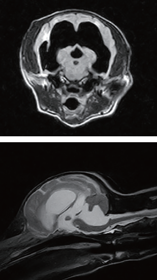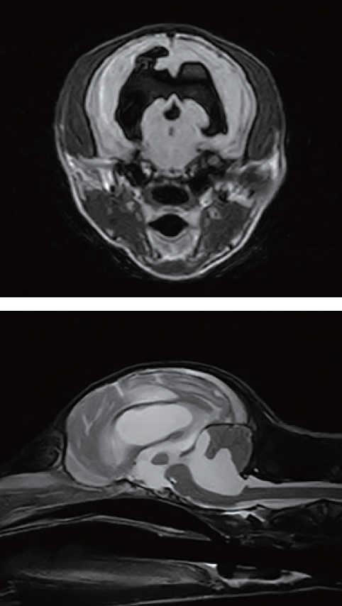 階段から落下後、起立不能を主訴に来院した。来院時は、意識レベル低迷、発揚、知覚過敏、外斜視、四肢不全麻痺による起立歩行不能であり、頭蓋内疾患を強く疑う神経症状から即日MRI検査を行い、先天性水頭症と診断した。本症の場合、慢性進行性の病態であり、内科的な治療効果は一時的・限定的である。長期的には臨床症状の悪化とともに、コントロールの限界は否めない。ともすると突然死のリスクもあり年単位での生存を望めない個体も少なくない。外科にはリスクや合併症も伴うが、長期予後を目指すために、V-Pシャント術を行った。術後経過は良好であった。術前の食欲不定、傾眠傾向、緩慢な様子から、術後は、意識レベルの改善、活動性向上、自力採食も安定しQOLが向上した。周術期を経てから投薬は不要となり、退院後は元気に走って散歩へ行くなど健常犬と変わらない日常を送っている。先天性水頭症の早期診断の重要性、早期外科の有用性を経験した1例である。